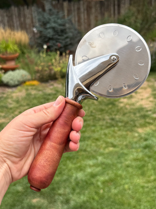 #137 - Camphor Burl Pizza Cutter with Sleeping Beauty Turquoise Cabochon