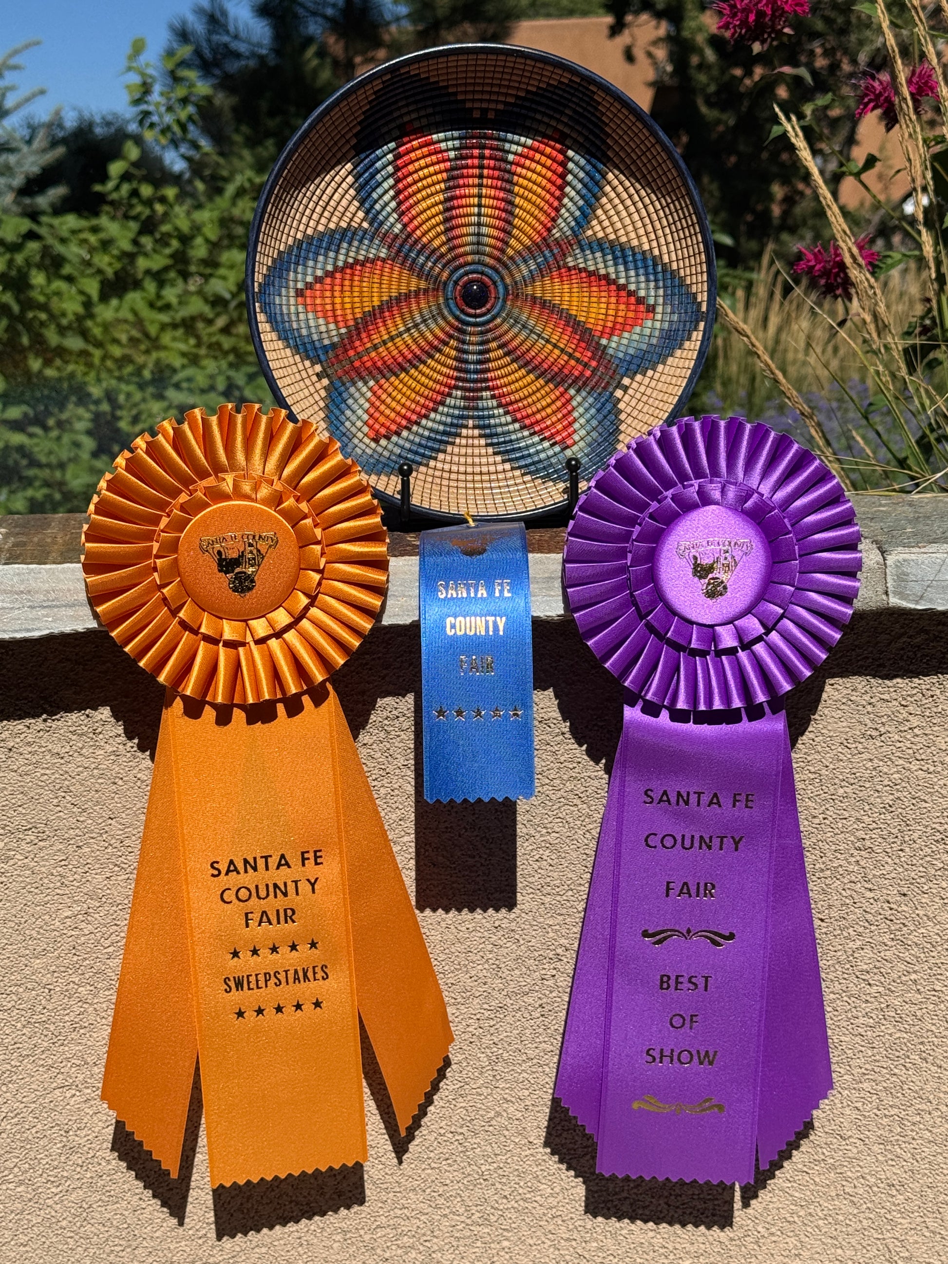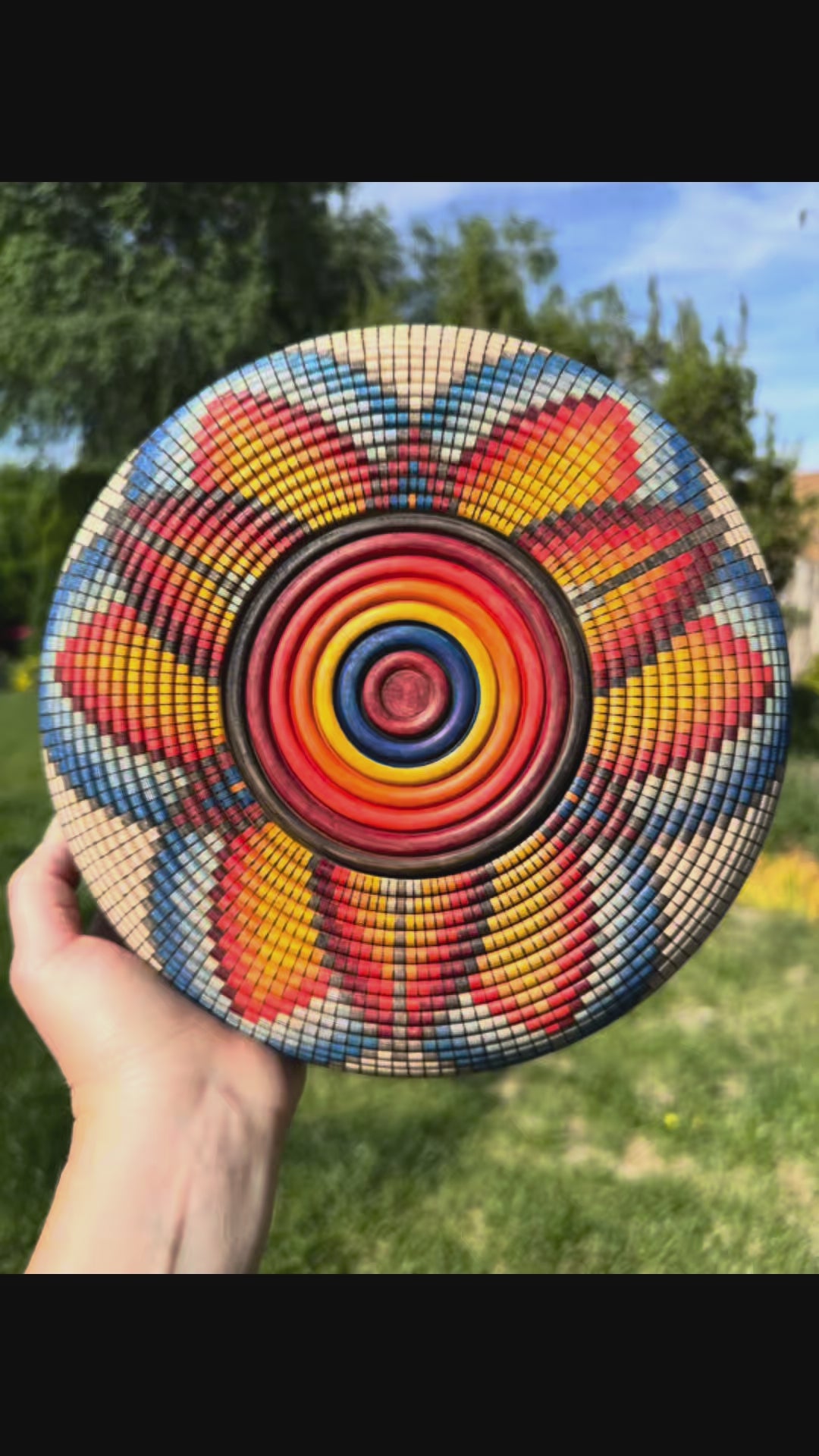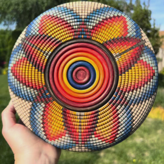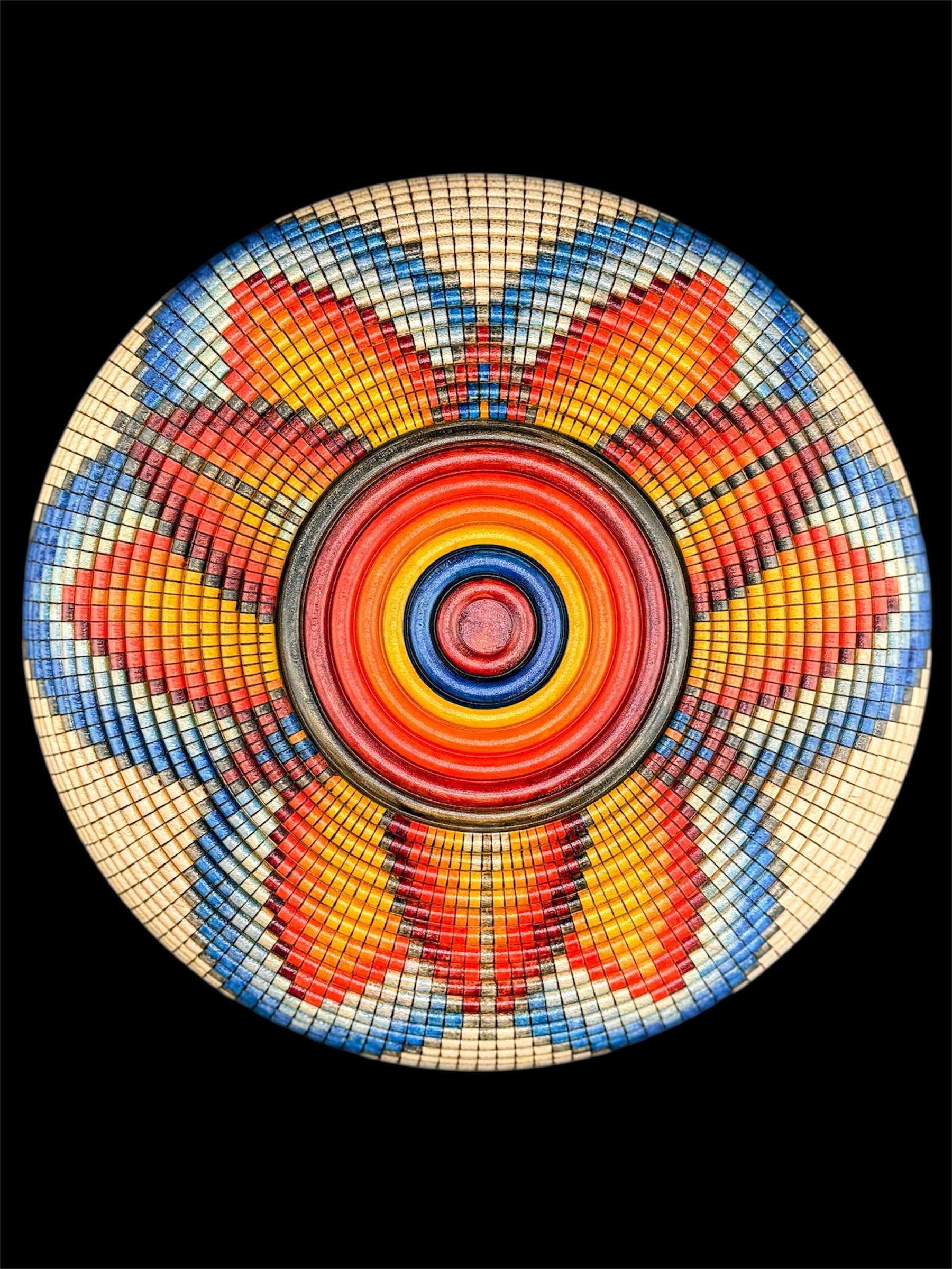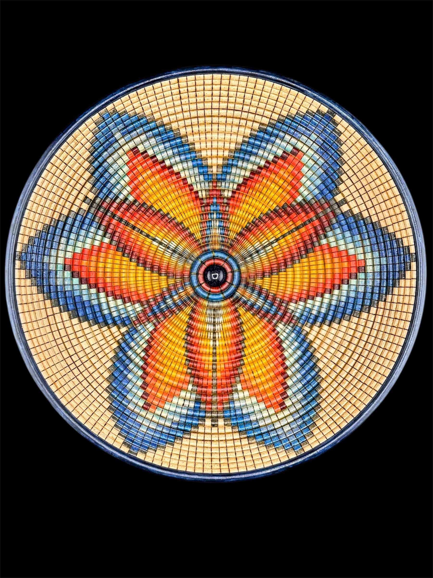 Winner of the 2025 Santa Fe County Fair Best of Show award! This basket illusion bowl is hand-turned from maple and contains 6,336 beads burned by hand. The design is creted using special india ink markers, and is finished with a stunning blue goldstone cabochon placed in the middle. The cabochon sparkles like a little galaxy sitting at the center of this basket-illusion universe.