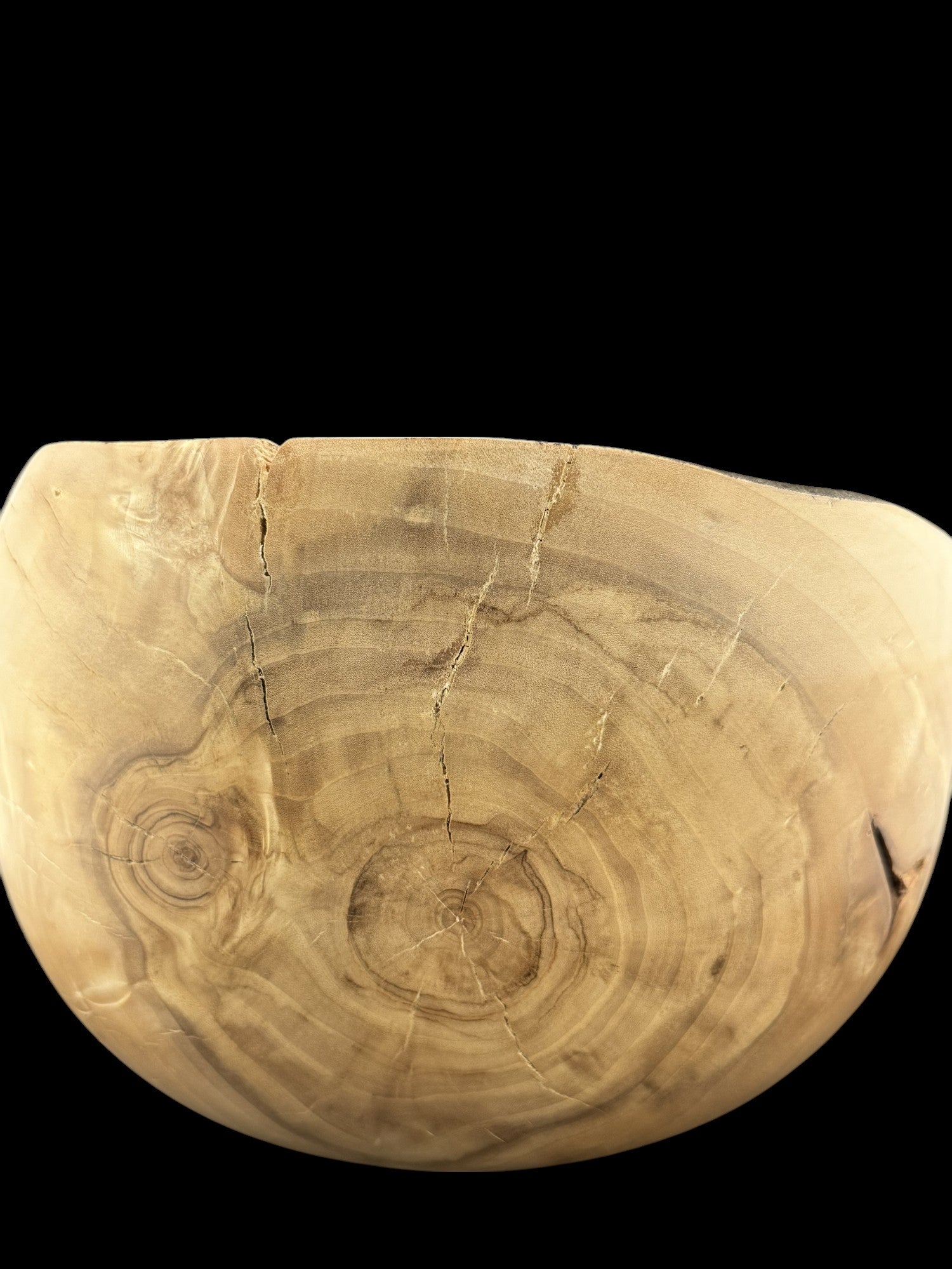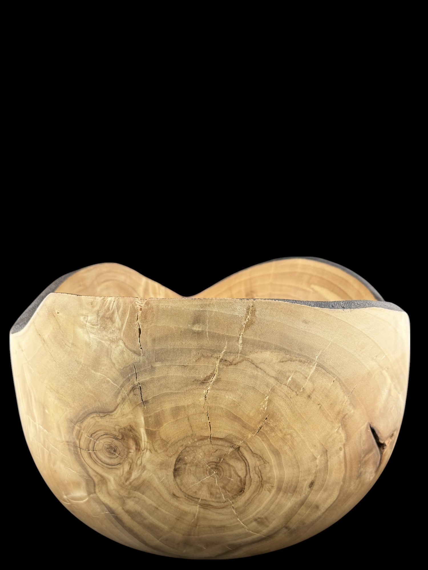 Stunning large cottonwood bowl with incredible figure. The rim is textured with thousands of tiny burned dimples and finished with Osmo oil stain. This bowl has it all: bark inclusions, chatoyance, knots and beautiful coloring. Perfect for use as a display piece! (not recommended for food use due to the cracks inside the bowl that can trap food) The bowl is finished with food-safe wax though please note the rim of the bowl was finished with a non-food-safe finish. Approx. 10" diameter x 6.5" high. The inside of the bowl measures 5.25" deep.