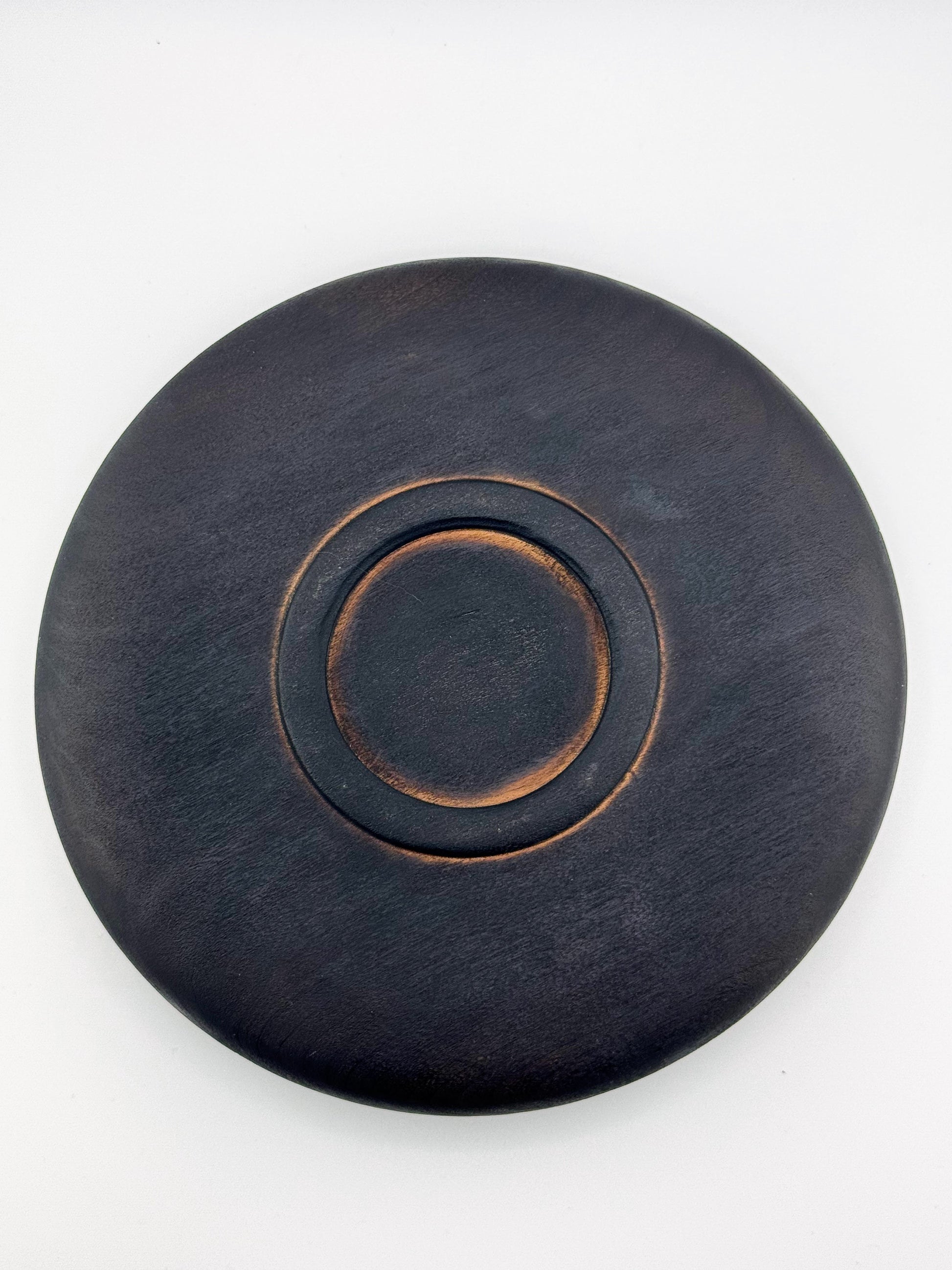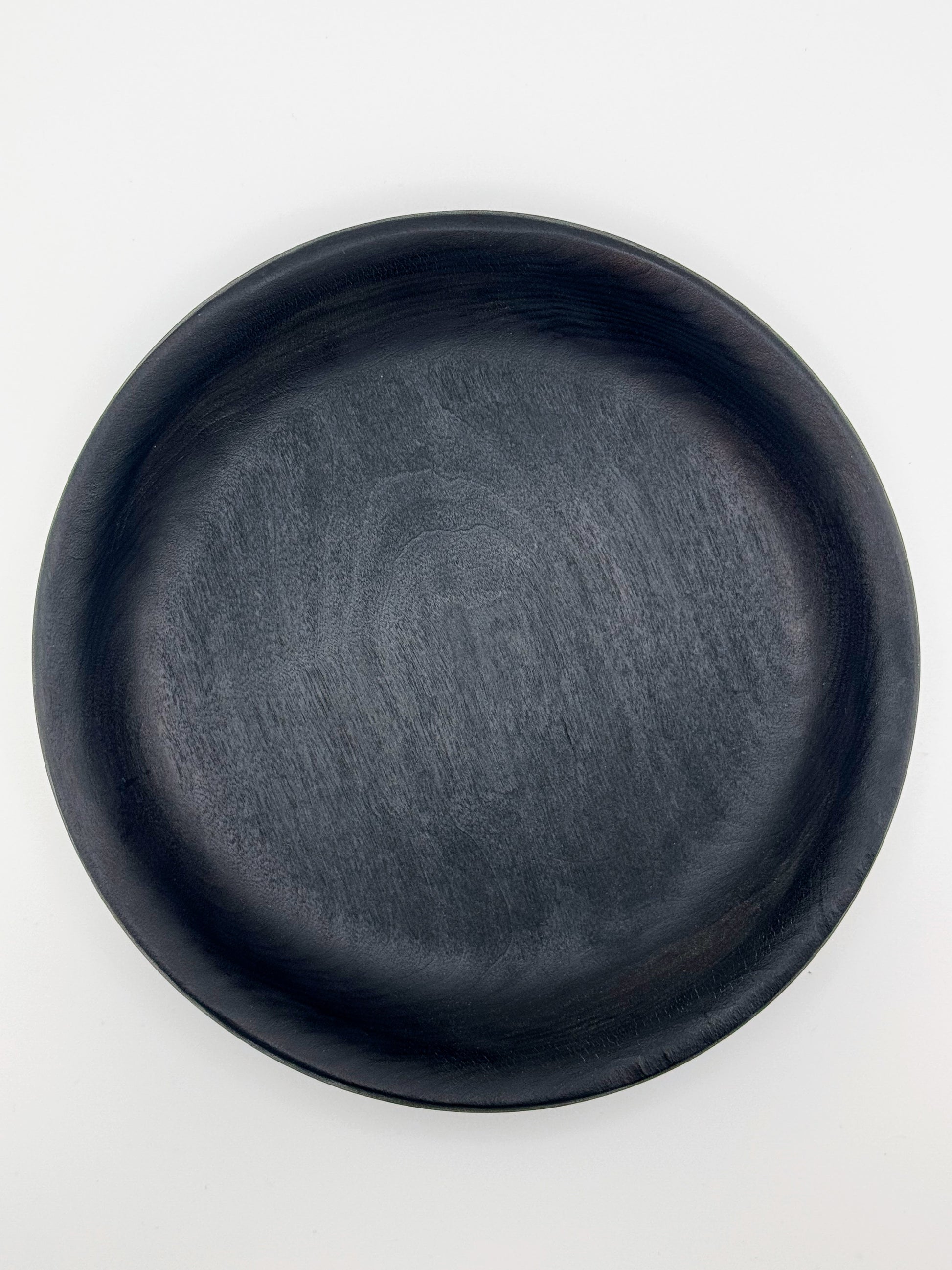 The Japanese technique of yakisugi (using flame to burn the wood's surface) was applied to the outside and inside of this medium Ambrosia Maple bowl. Once burned, the wood was stiff-brushed to remove the softer charred woodgrain and leave the swirling ridges of harder grain. The bowl was then sealed all over with a food-safe penetrating oil to preserve and smooth the surface.