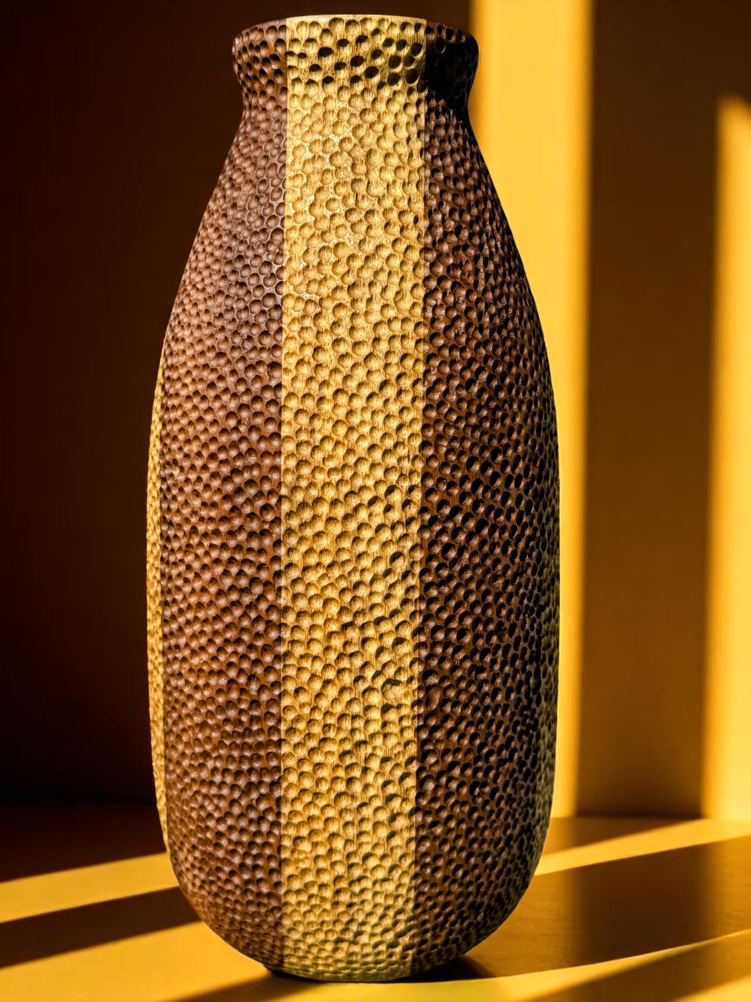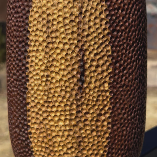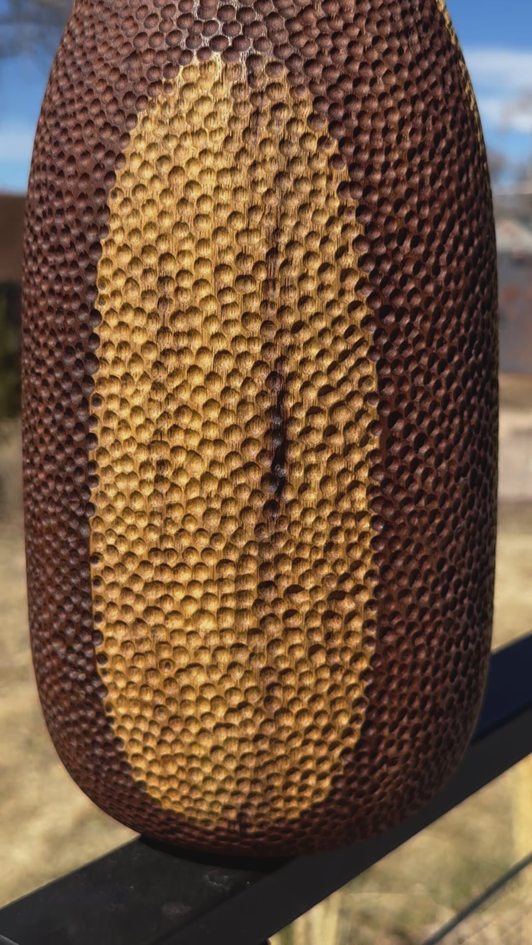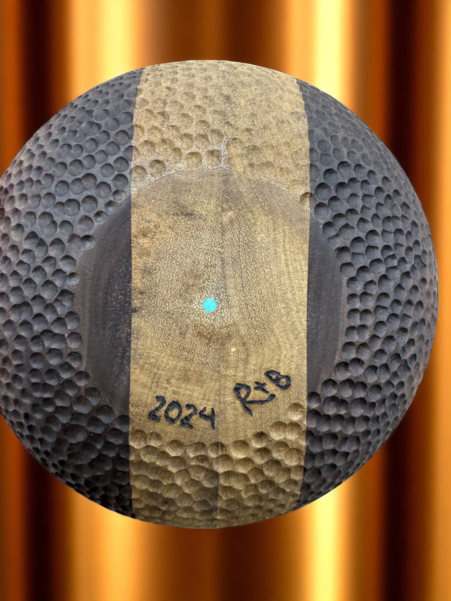Incredible walnut and white limba tall textured vase with turquoise inlay in the base. For displaying dry arrangements only. White limba is a hardwood with a light yellowish to golden brown coloring.