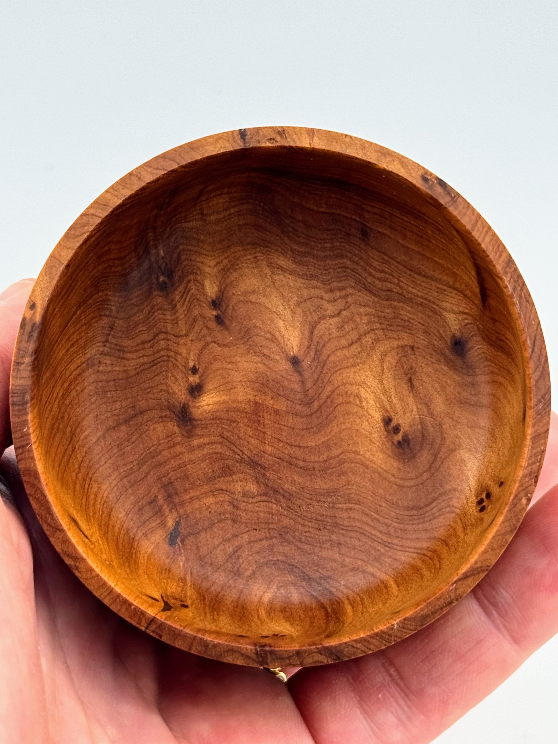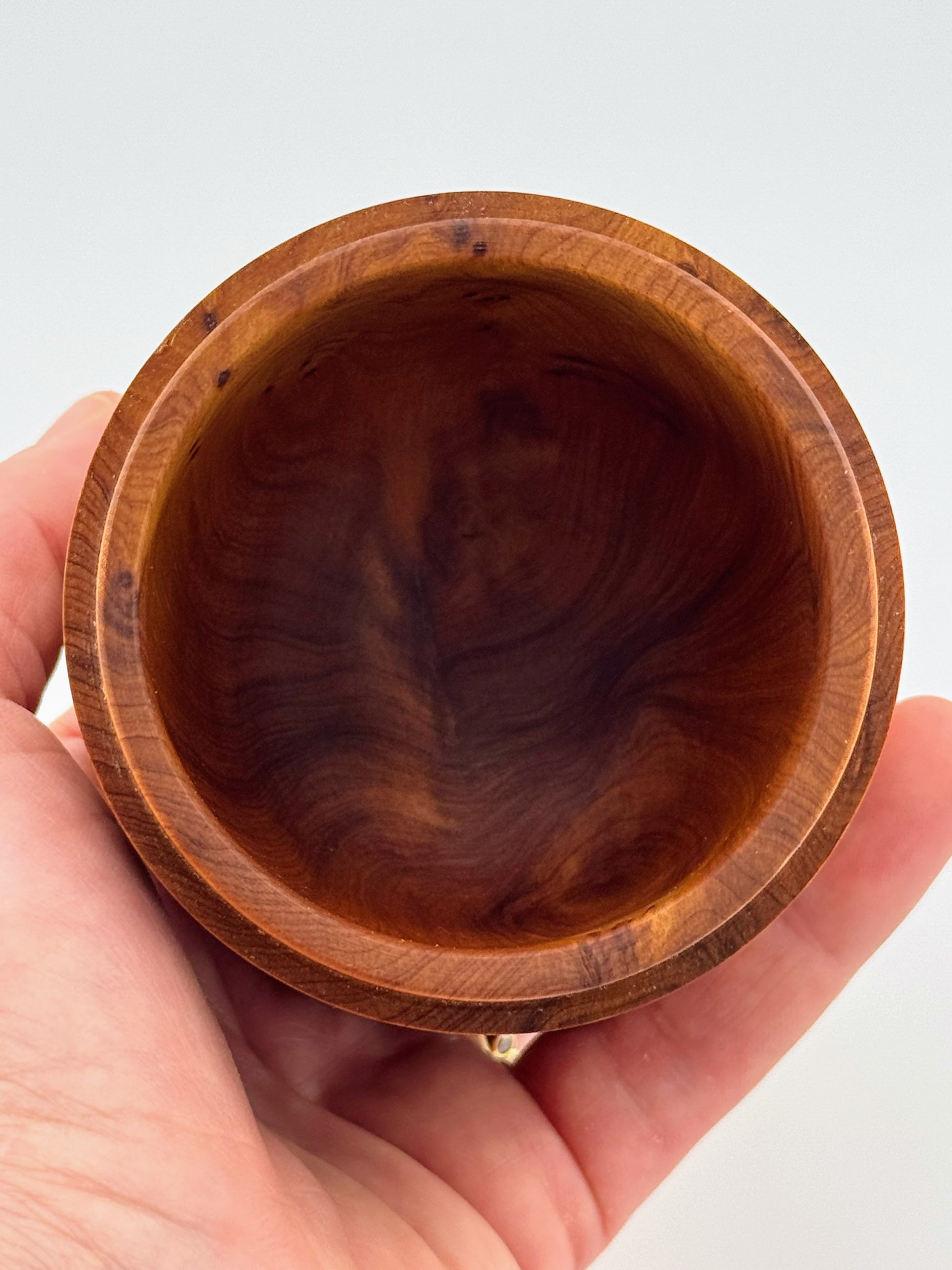 Stunning, fragrant Thuya Burl and Walnut combine for a delicate, showtopping box. The swirling fingerprint-like grain patterns and birdseye of the Thuya Burl make for a truly unique piece, with plenty of room for precious belongings inside. The spicy fragrance of the wood is released each time the box is opened (unless opened, the box does not contain a noticeable fragrance). A curved 'flame' comprises the walnut finial, which is used to pull open the box. Finished with food safe oil. Please note there is a hairline crack in the lid along the rim - it is virtually invisible to the eye unless you are looking for it. It has been repaired with glue and should not cause any issues.